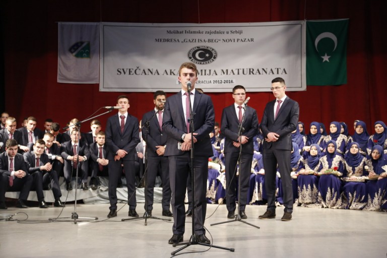 U prepunoj sali Doma kulture u Novom Pazaru upriličena je večeras Svečana akademija povodom ispracaja 504-te generacije maturanata (2012-2016) Medrese Gazi Isa-beg, uz prisustvo velikog broja roditelja, vjernika i posebnih gotiju: narodnig poslanika muftije Muamera ef. Zukorlića, predsjednika Mešihata IZ u Srbiji muftije dr. Mevlud ef. Dudića, izaslanika reis-ul-uleme IZ u BiH dr. Enesa ef. Svrake, predsjednika Sabora IZ dr. Envera ef. Gicića, hafiza Abdurahmana ef. Kujevića, rektora IUNP dr. Suada Bećirovića, direktora Medrese Gazi Isa-beg u Novom Pazaru Rešada ef. Plojovića i drugih visokih zvanica, predstavnika vjerskog i kulturnog života.