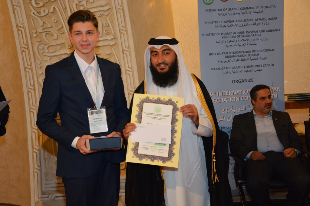 Pobijedivši u kategoriji hifza cijelog Kur’ana osvojio je nagradno putovanje na hadž te je, ujedno, i nositelj priznanja i nagrade Hafiz Fadil ef. Fazlić, koja se, po odluci Medžlisa IZ-a Zagreb, već petu godinu, dodjeljuje najboljem takmičetelju. Novčanu nagradu od 500.00 eura svake godine osigura porodica rahmetli hadži hafiza Fadila ef. Fazlića.